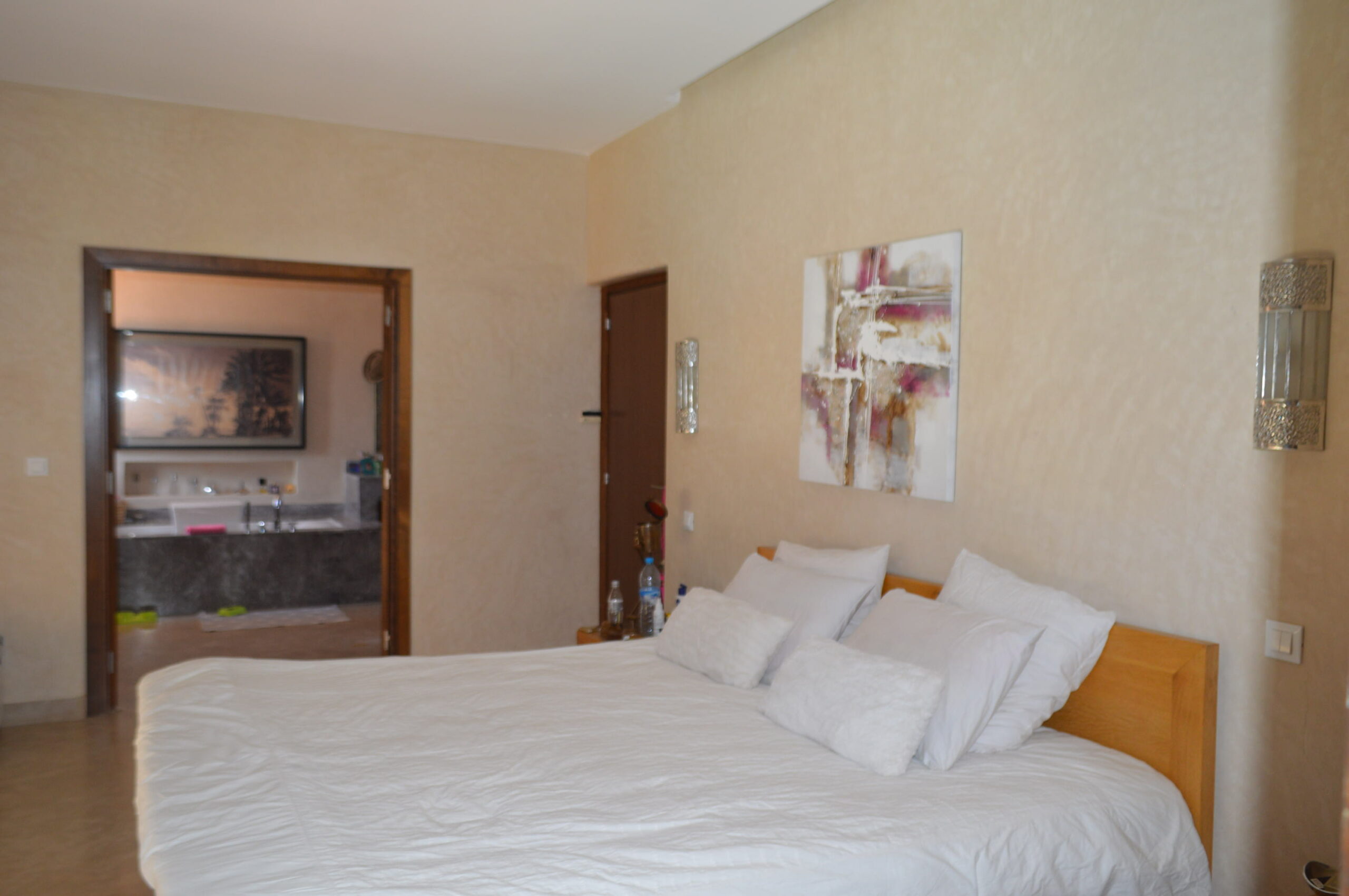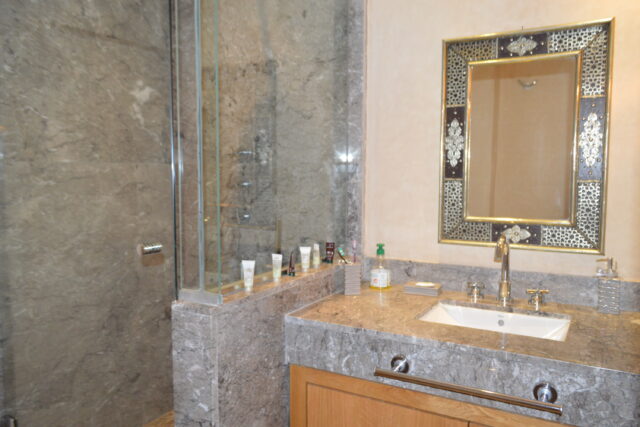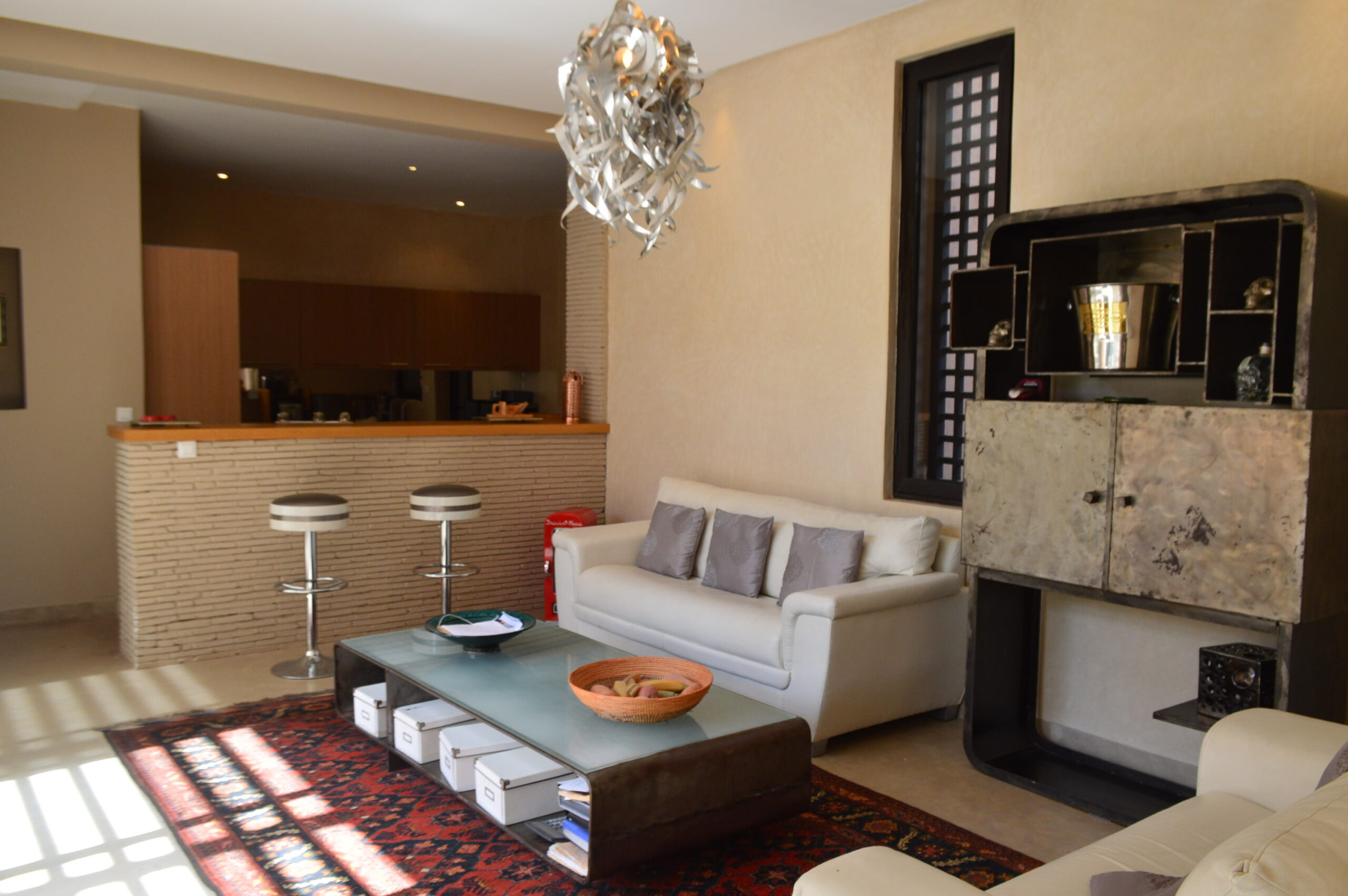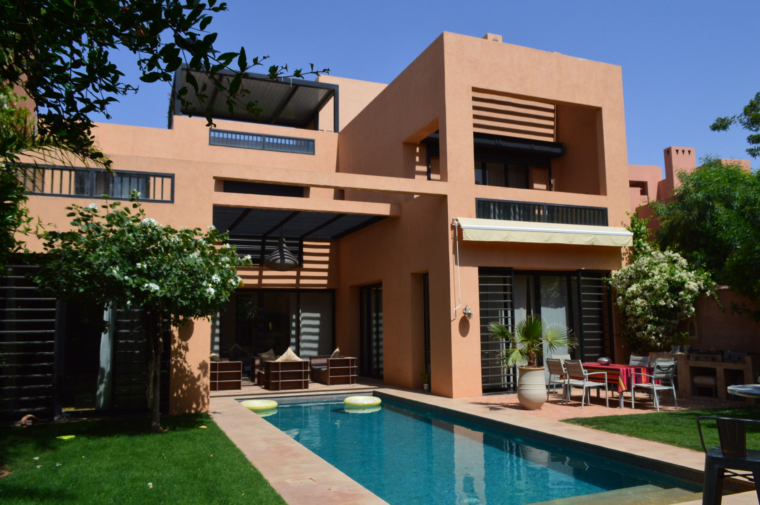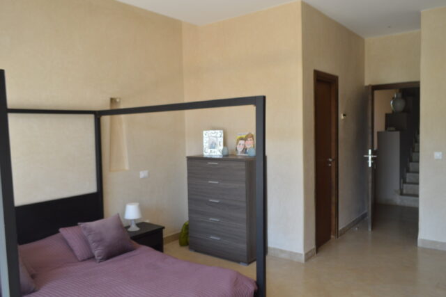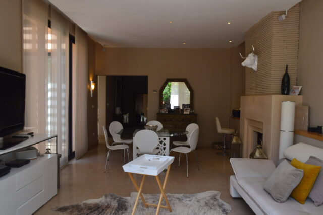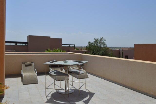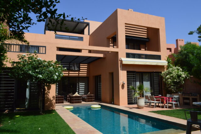 A seulement 10 minutes du centre ville de Marrakech, savourez le privilège de vous évader dans un site intemporel, exclusif, inoubliable et convivial loin de l’agitation et des foules. Située en bordure d’un parcours de golf de 18 trous, dessiné par Kyle Phillips, cette villa contemporaine est conçue dans un ensemble résidentiel piéton préservant un caractère urbain traditionnel, associent raffinement, modernité et élégance. Articulée autour d’un patio devant la piscine , découvrez au rez-de-chaussée son grand séjour avec cheminée, son espace bar, sa cuisine ouverte, une belle suite et une buanderie . Au 1er étage, deux grandes suites dont la master bed room avec sa salle de bain de maître et son dressing. Sur le toit, un véritable espace bien être vous attends: solarium avec pergola bioclimatique, jacuzzi et hammam! Cette villa a la particularité d’avoir entièrement été revisitée par son propriétaire: volets électriques, panneaux solaires…. Venez la découvrir!