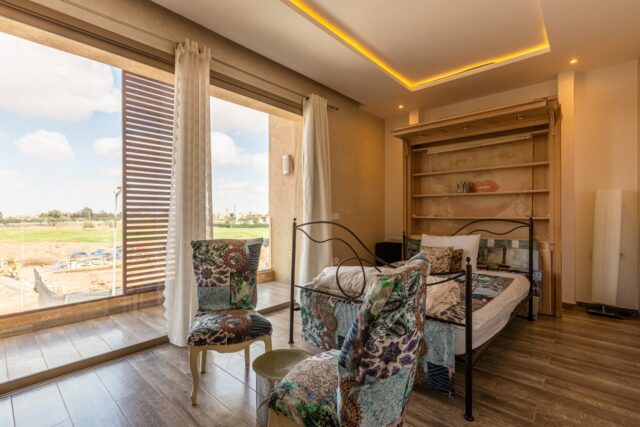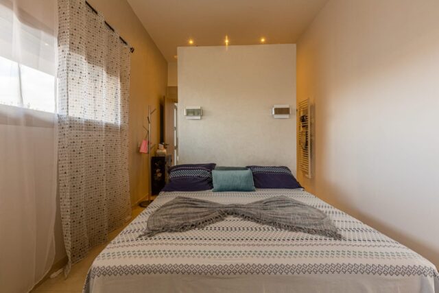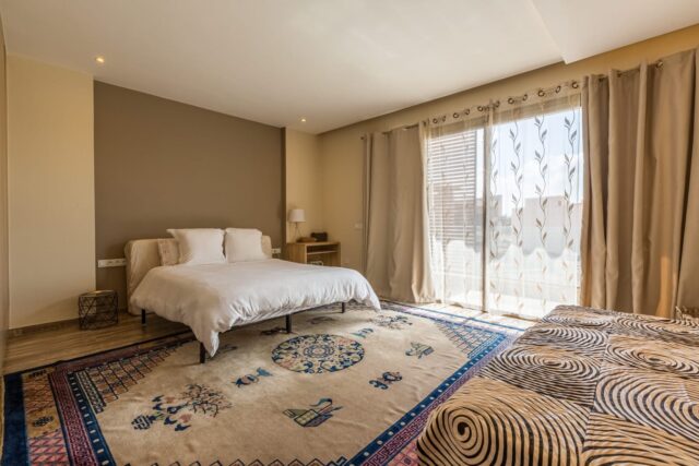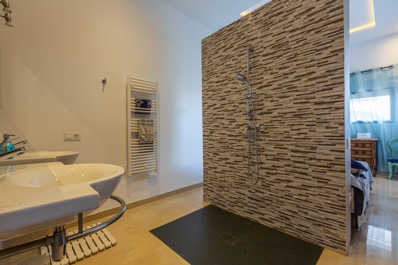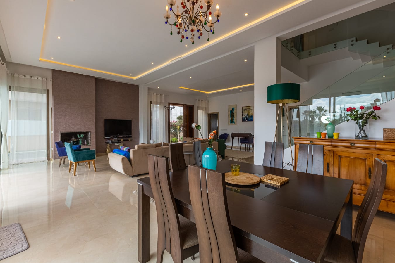 Au RDC, 1 Chambre avec sdb privative, grand salon donnant sur la Piscine, Coin cheminée, Cuisine équipée avec accés direct à la villa de l’extérieur.