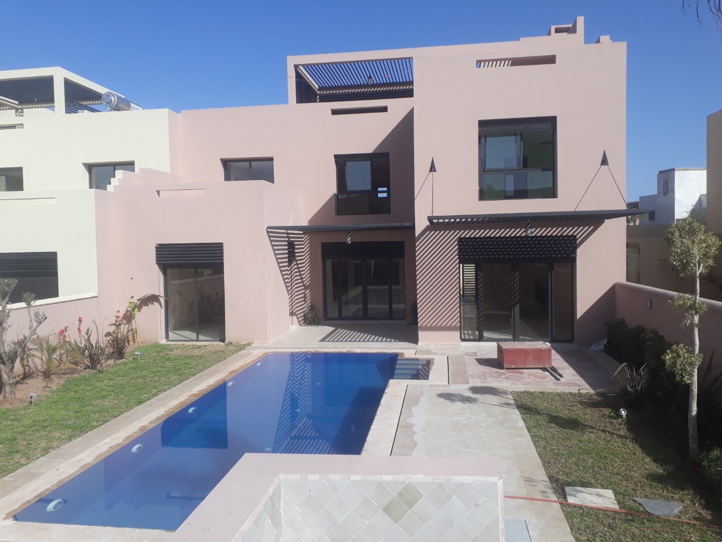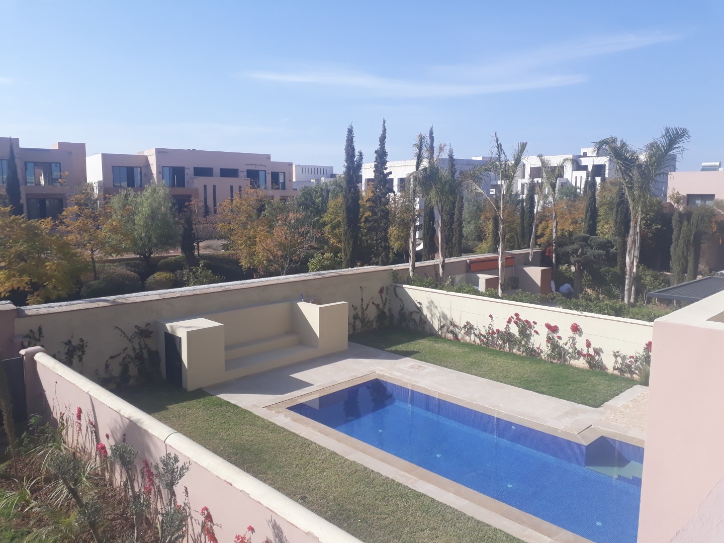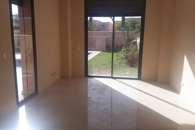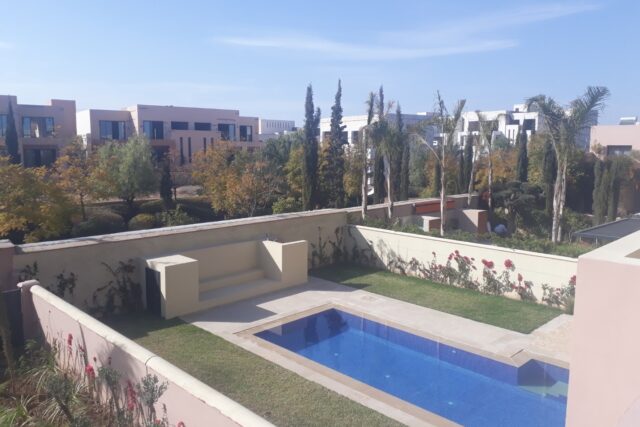 Villa style Ryad dans une résidence golfique et sécurisée de haut standing, d’une superficie de 300 m² environ comprenant 3 Chambres, Un Salon, Salle à manger , Cuisine américaine entièrement équipée , donnant sur un Jardin avec Piscine et Terrasse + dépendances.